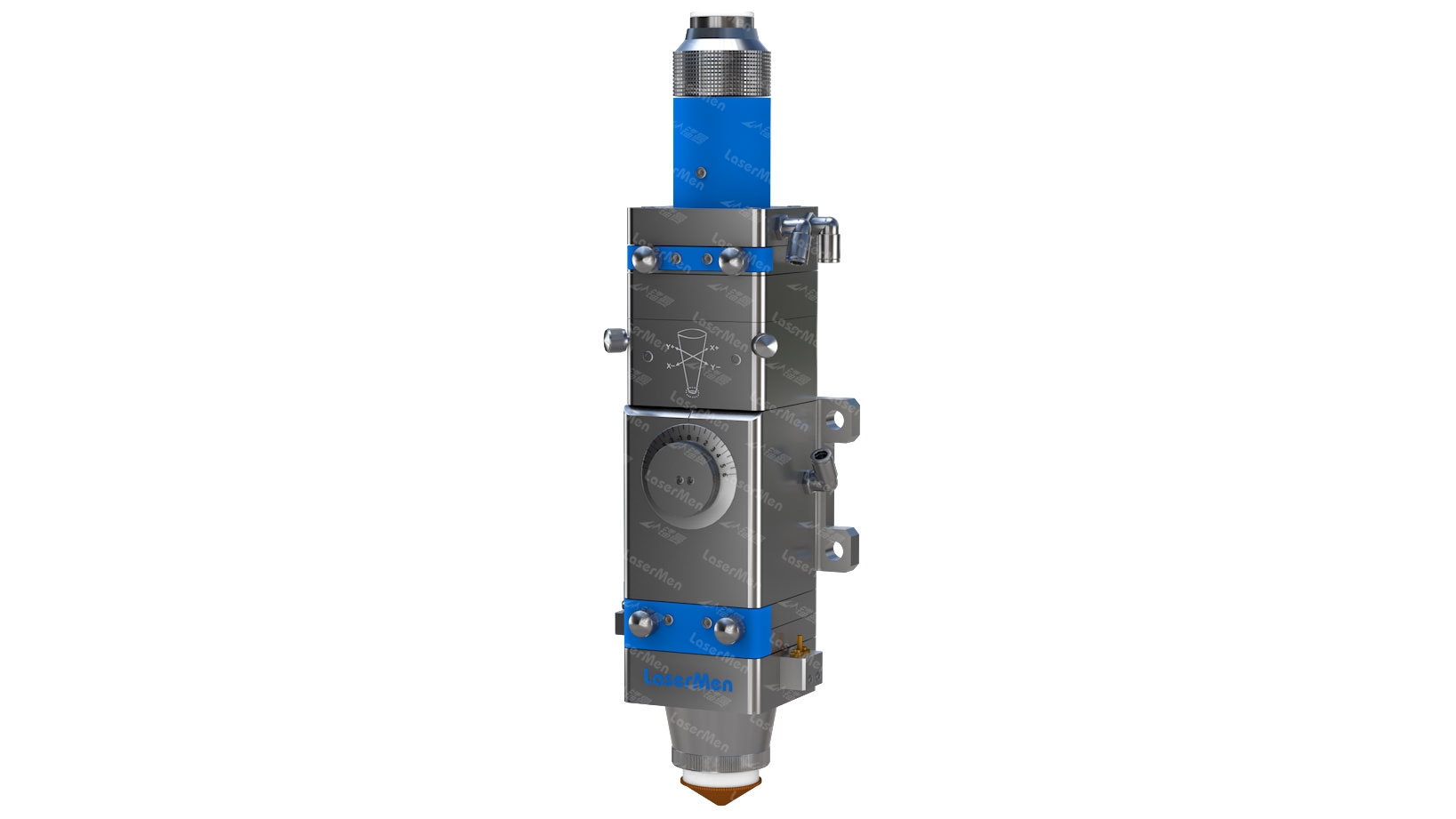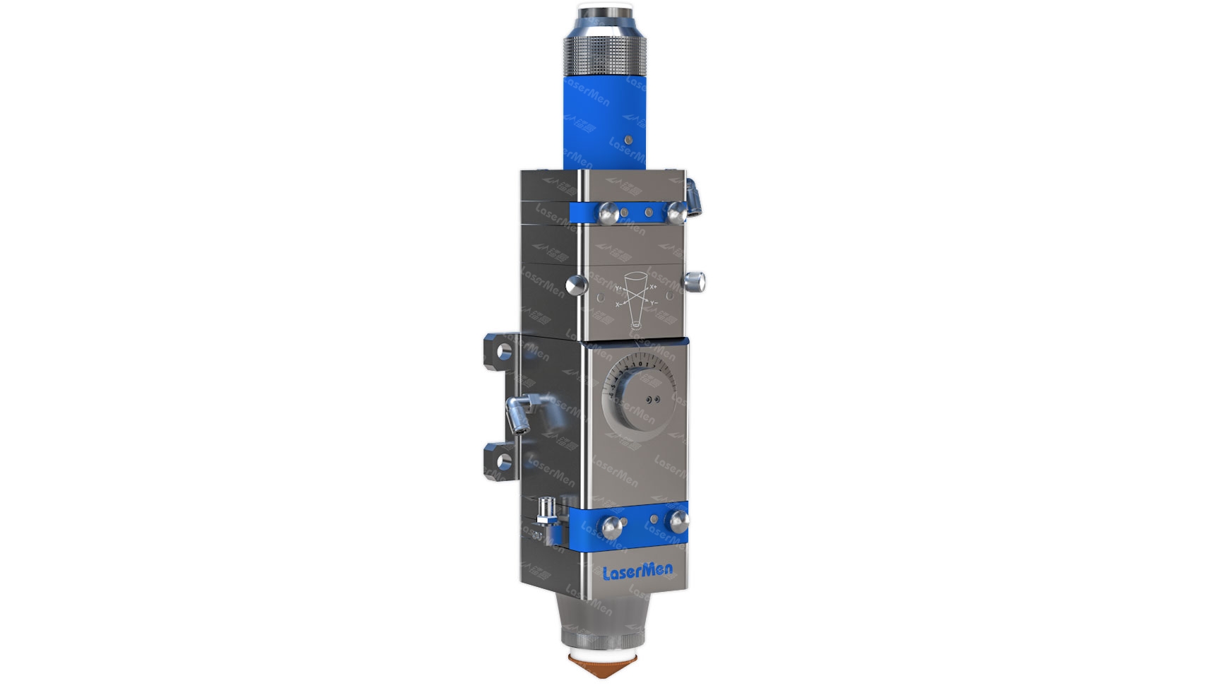 激光切割系統(tǒng)用光纖激光切割頭,包括從上向下順次同軸連接的光纖接頭、水平調(diào)節(jié)裝置、調(diào)焦裝置、保護(hù)鏡裝置、導(dǎo)氣裝置和切割頭,其特征在于:調(diào)焦裝置中,調(diào)焦筒活動裝配于調(diào)焦筒滑道內(nèi),調(diào)焦旋鈕座緊固于焦點(diǎn)調(diào)節(jié)座上,調(diào)焦刻度盤與調(diào)焦旋鈕座緊固在一起,調(diào)焦旋鈕通過調(diào)焦刻度盤卡裝在調(diào)焦旋鈕座內(nèi)孔中,調(diào)焦旋鈕能順暢旋轉(zhuǎn)運(yùn)動但不能軸向移動;調(diào)焦筒連接板外側(cè)設(shè)有一卡槽,調(diào)焦旋鈕內(nèi)側(cè)設(shè)有一環(huán)形凸臺,環(huán)形凸臺中心與調(diào)焦旋鈕的旋轉(zhuǎn)中心偏置,環(huán)形凸臺配合嵌置在卡槽內(nèi);聚焦鏡片安裝在調(diào)焦筒內(nèi)。本發(fā)明調(diào)焦調(diào)節(jié)快速,能夠確保切割質(zhì)量;保護(hù)鏡拆卸方便,拆裝后不需調(diào)整;導(dǎo)氣裝置能有效輔助激光切割,提高切割質(zhì)量。